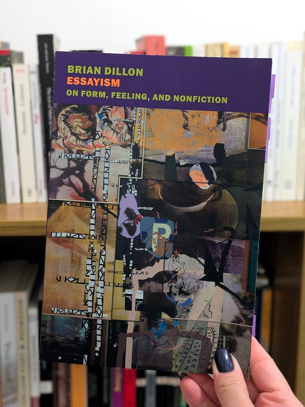 I found some solace in Brian Dillon’s Essayism, a collection of short essays on the essay, a genre I have been drawn to lately (enough to even call this missive an “essay,” if you caught it above). I was expecting any type of comfort when I first started reading it, but it build up through its pages, almost unexpected. Certainly unannounced. I am firmly against the notion that nonfiction (or literature in general) should be read exclusively for its practical solutions and effects, but sometimes it so happens that affects are touched. One of the advantages of reading and writing outside academia is letting that happen earnestly rather than try and hide it behind any contribution to the field (except for: the field is me, my brain, let others enrich this soil and see what blooms).